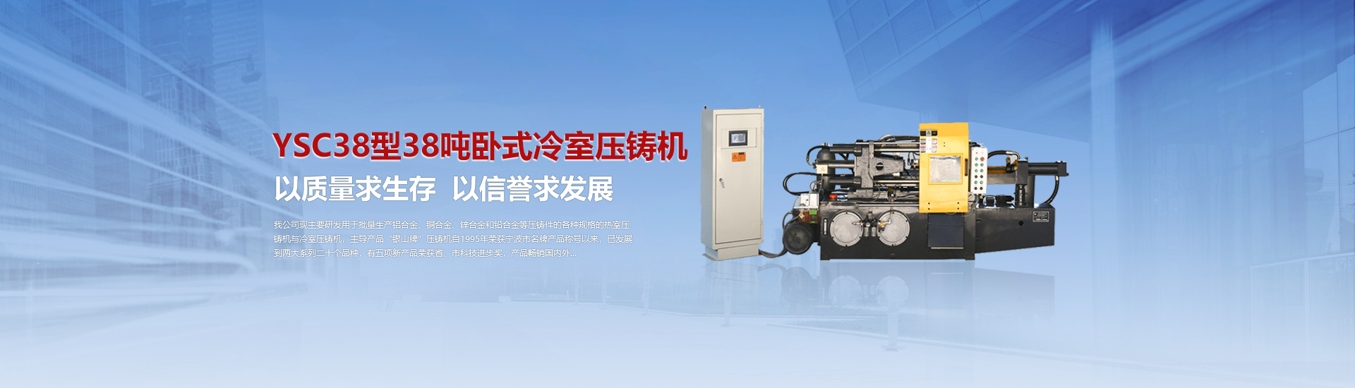 我司現主要研發用于批量加工生產鋁合金、銅合金、鋅合金和鉛合金等壓鑄件的各種型號規格的熱室/冷室壓鑄機,主導產品“銀山牌”壓鑄機自1995年榮獲寧波市名牌產品稱號以來,已發展到兩大系列二十個品種,有五項產品曾榮獲省、市科技進步獎,產品暢銷國內外。歷年來向用戶提供了8000余臺設備,為中國的壓鑄工業發展作出了重要的貢獻,企業獲得了很高的信譽度。